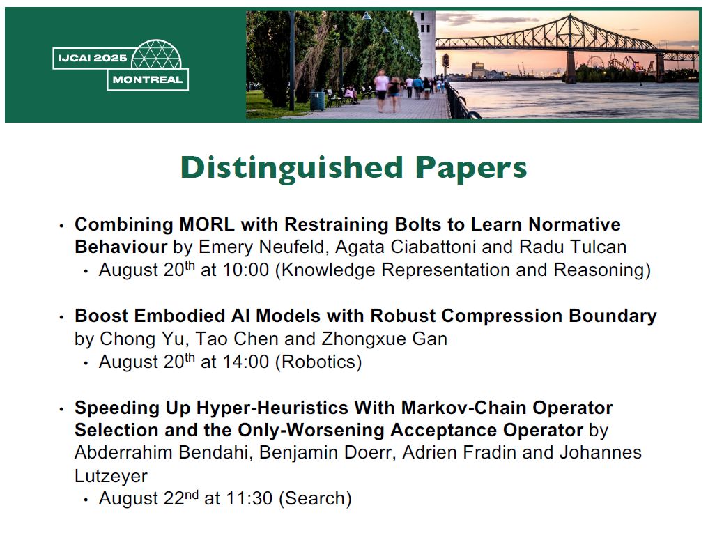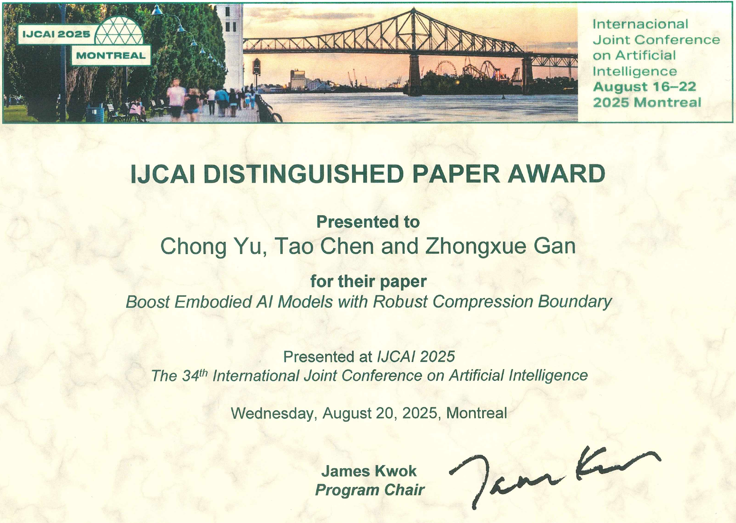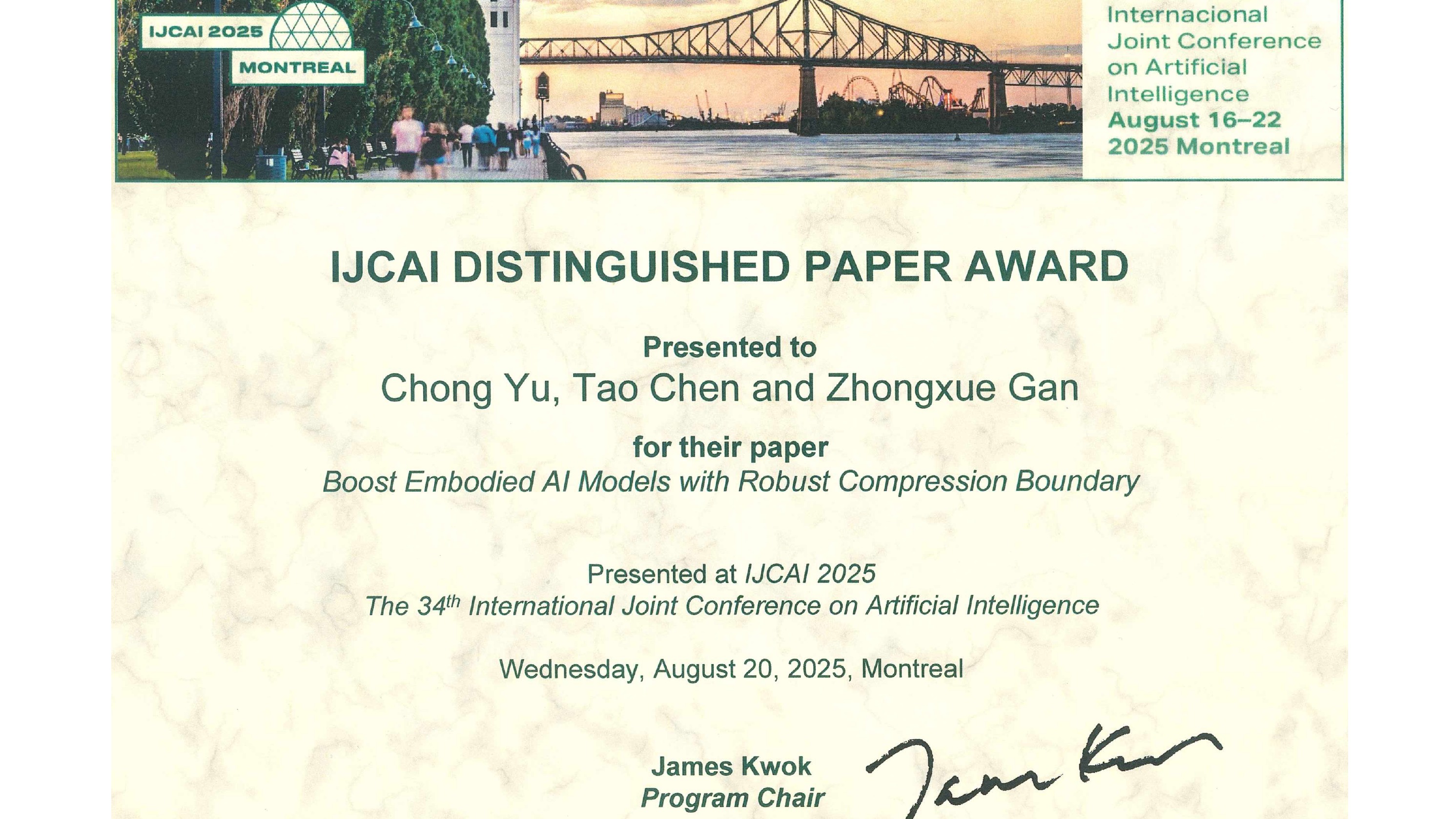 第34届国际人工智能联合会议IJCAI(International Joint Conference on Artificial Intelligence)8月16日在加拿大蒙特利尔隆重召开。本届会议共收到5404篇投稿,大会组委会评选出3篇杰出论文奖。智能机器人与先进制造创新学院余翀博士作为第一作者、甘中学教授与未来信息创新学院陈涛教授作为共同通讯作者的研究论文《Boost Embodied AI Models with Robust Compression Boundary》荣获第34届国际人工智能联合会议(IJCAI)杰出论文奖。研究成果受到上海市人工智能重大专项支持。