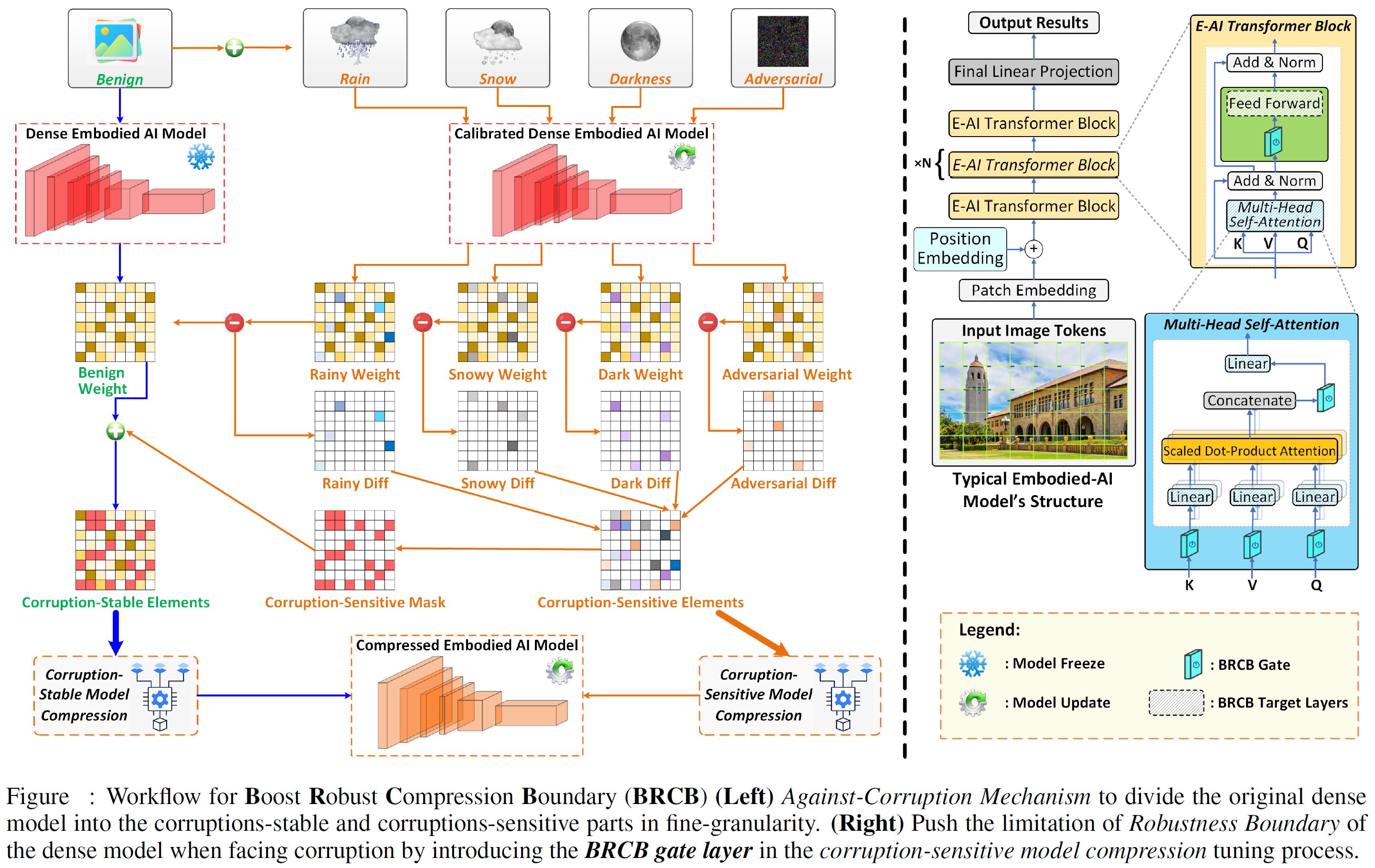 深度学习模型与物理世界的融合推动了具身智能(Embodied AI)能力的飞速提升。然而,强大的具身智能模型及其规模也带来了日益严峻的部署效率挑战。与数据中心相比,具身智能平台的计算资源和内存带宽更为有限,因此效率问题在这些平台上表现得更加突出。同时,大多数具身智能场景(如自动驾驶和机器人)对响应速度有更高的敏感性。具身智能场景对响应速度和鲁棒性要求极高,传统模型压缩方法虽能提升效率,但压缩后的模型在面对各种现实扰动(如模糊、夜晚低光照、恶劣天气,甚至对抗性扰动)时的鲁棒性往往大幅下降,严重影响具身智能模型与物理世界交互效果。