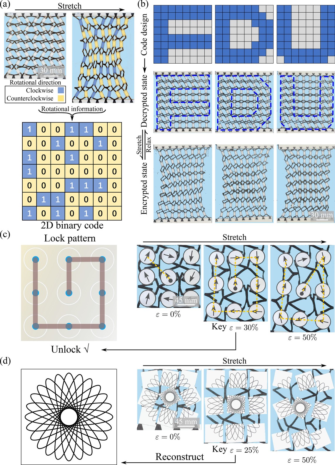 研究人员还开发了应变触发的信息编码与解码功能,基于胞元刚性体旋转方向的二进制编码实现视觉图案加密,设计了九宫格应变解码器以及应变触发的图像信息重构功能(图5)。