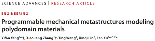 近日,智能机器人与先进制造创新学院智柔体设计与制造实验室徐凡教授团队创制了一种可视化可编程拟液晶超结构,通过宏观尺度可视化编程实现了对序构多畴材料独特力学行为的精确模拟与智能调控。研究成果《Programmable mechanical metastructures modeling polydomain materials》发表于国际一流学术期刊Science Advances (2025, 11, eadz9811)。智能机器人与先进制造创新学院助理教授杨易凡、博士生张晓亮为论文共同第一作者,徐凡教授为通讯作者,合作者包括博士生林昕琦、同济大学助理教授汪婷。研究得到国家杰出青年科学基金、上海市基础研究特区计划、上海市教委等资助。