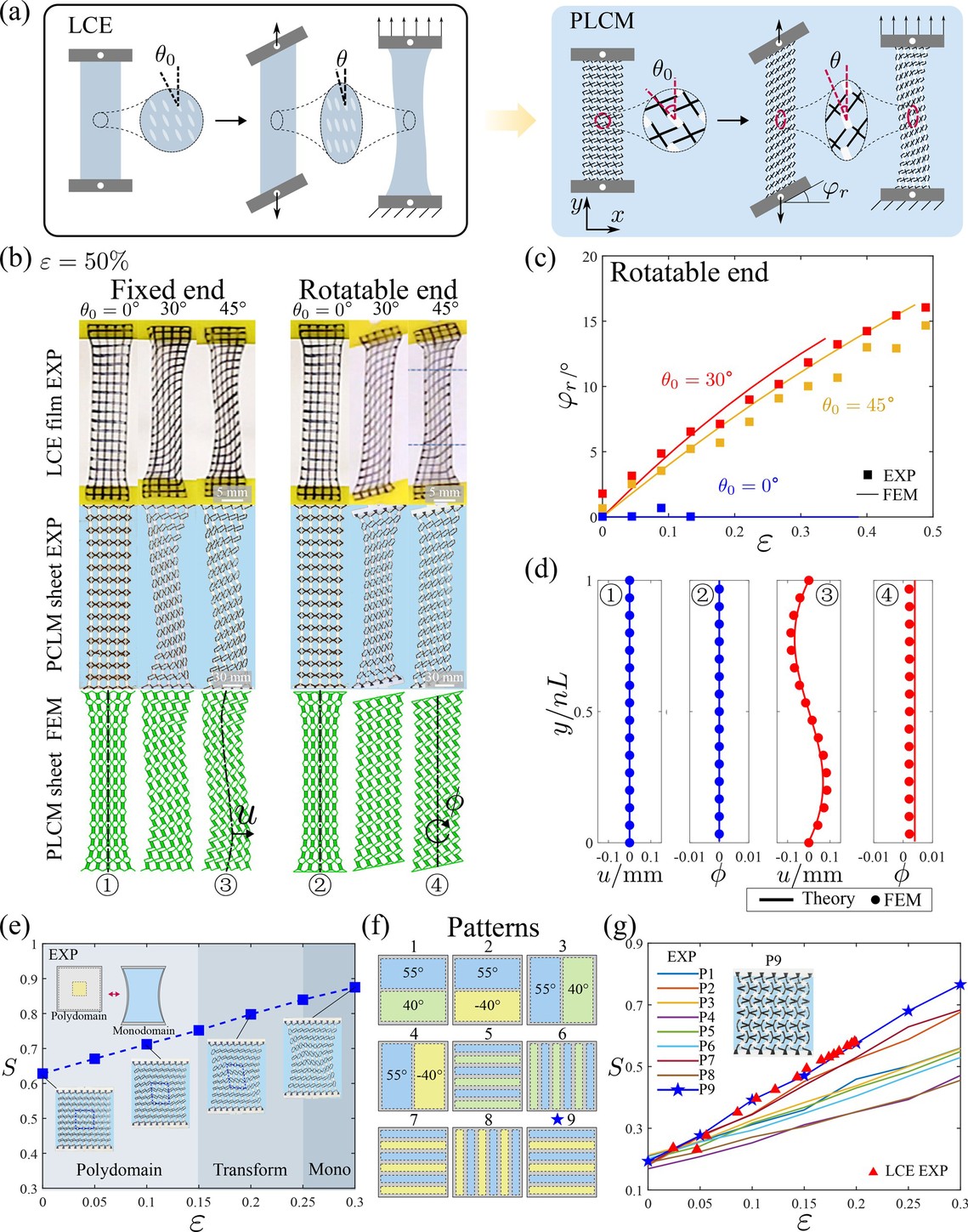 图2. 拟液晶超材料(PLCM)薄膜单轴拉伸和多畴-单畴(P-M)相变