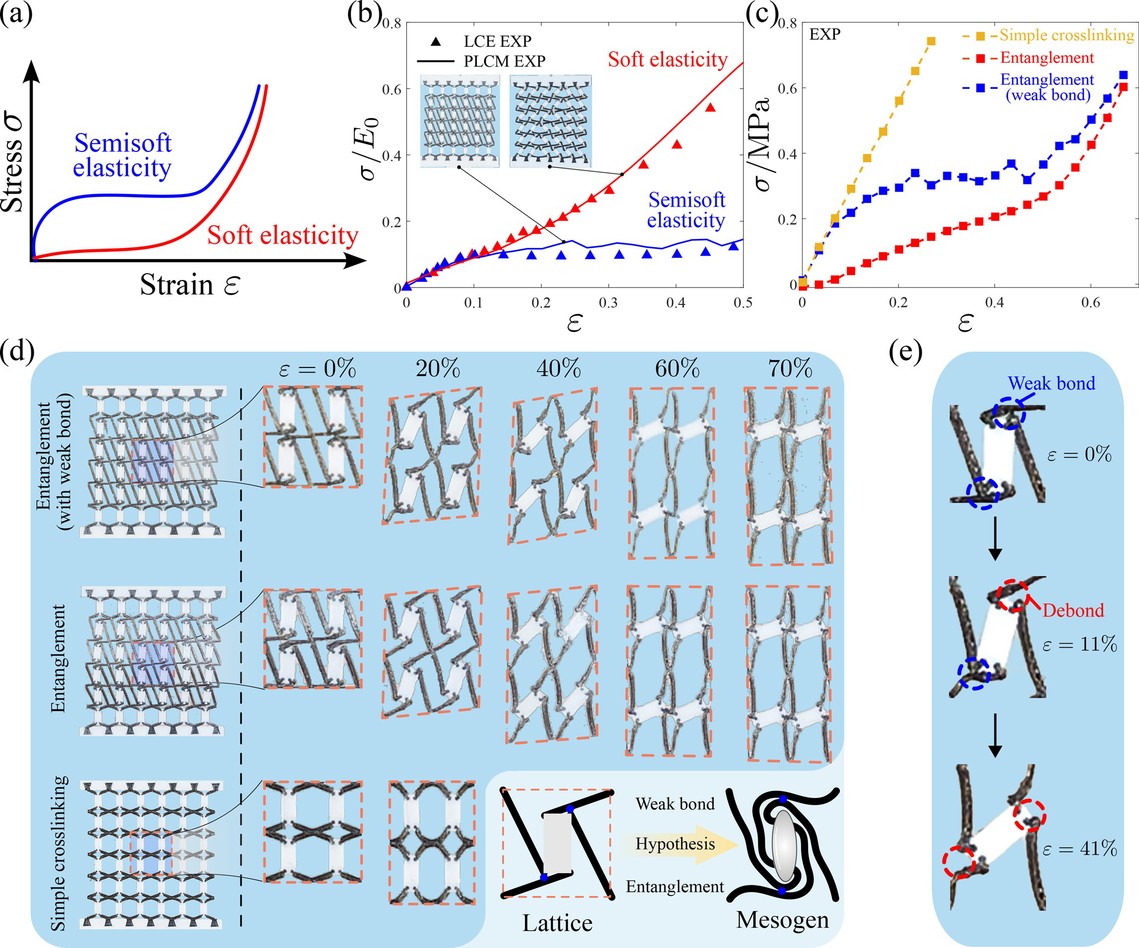 研究人员进一步通过调控胞元间的交联拓扑结构,实现了对材料应力-应变响应的灵活编程(图3)。通过设计简单交联单元和缠结交联单元等不同拓扑构形,成功模拟了真实液晶弹性体的软弹性和半软弹性“平台”特性。研究发现软梁的脱粘现象是产生应力平台的关键机制,揭示了真实液晶弹性体半软弹性响应可能源于分子网络不完全交联导致的弱键约束。