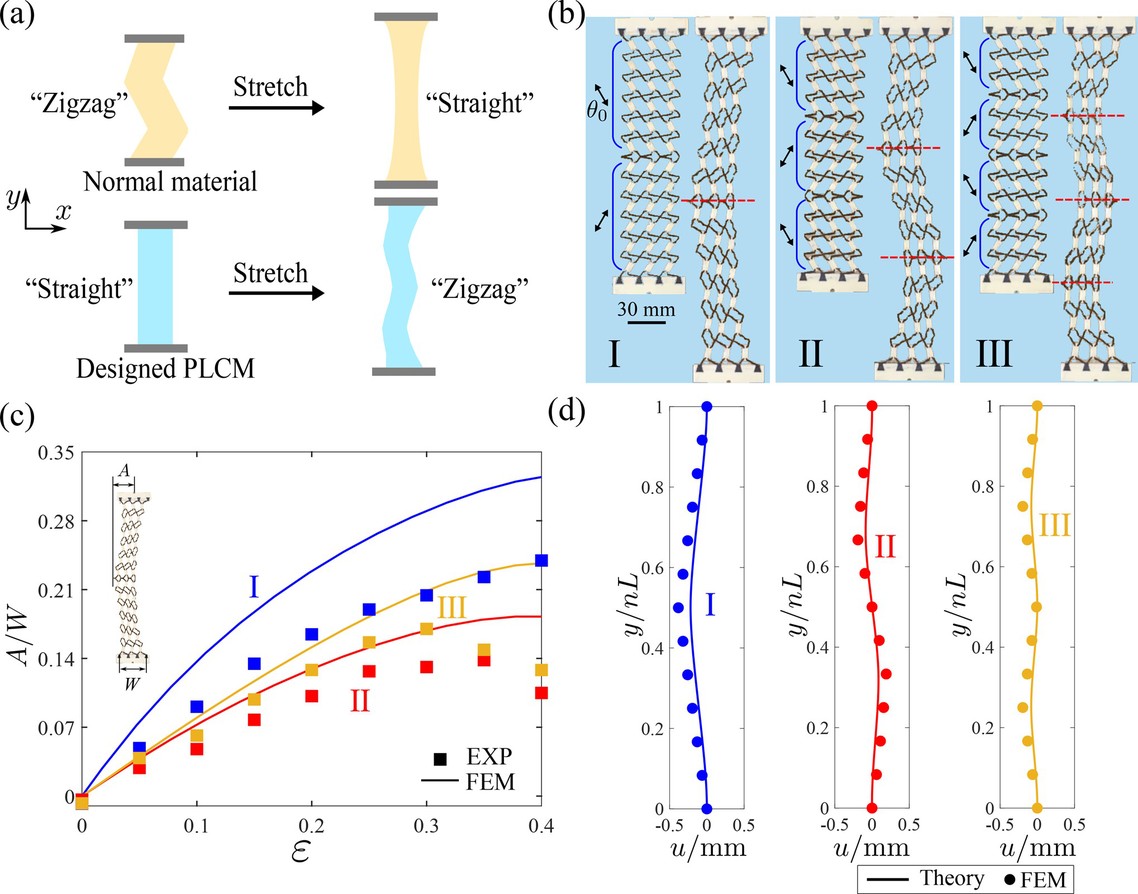 拟液晶超材料可实现多种复杂功能的可编程宏观设计。通过精心设计畴的排布取向,实现了受拉伸时的反常Zigzag弯折变形,突破了材料“受拉变直”的经典变形规律(图4)。