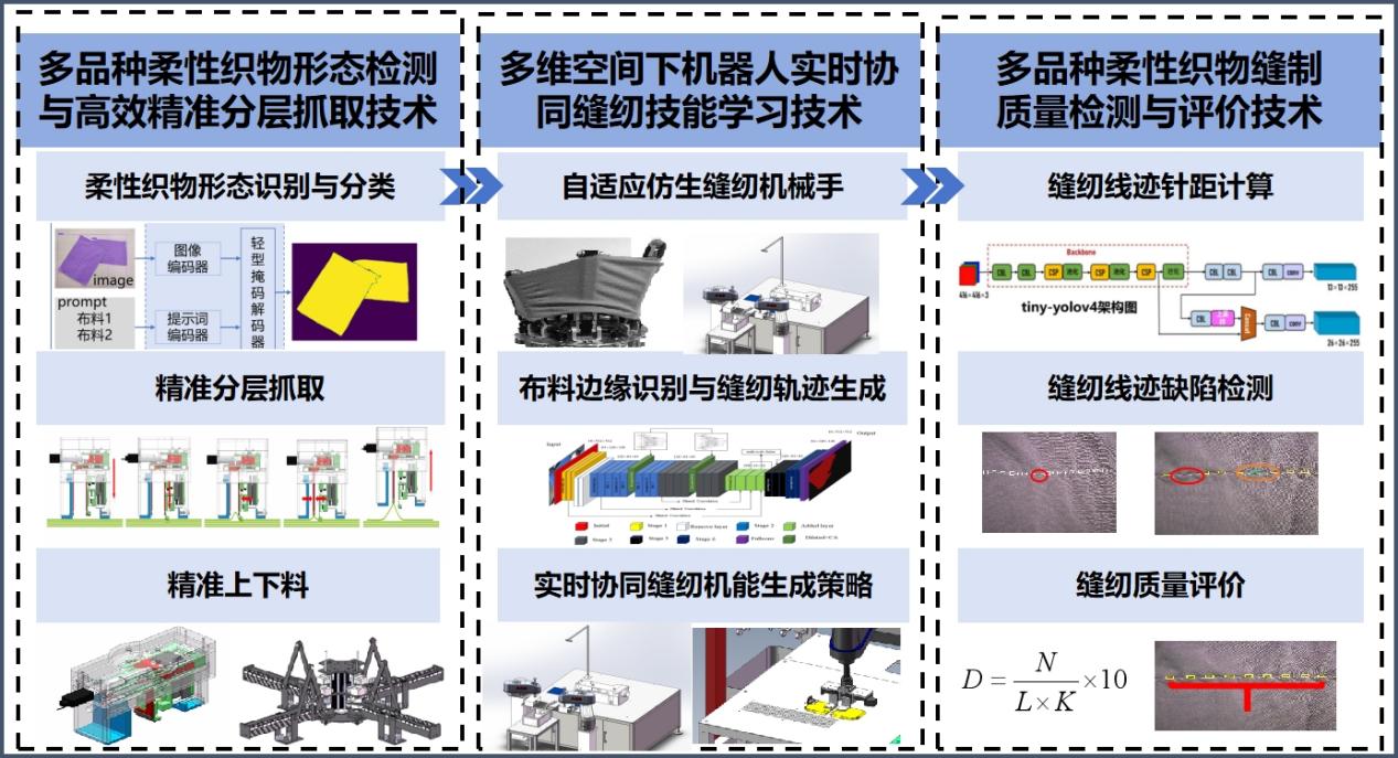 我国是全球第一大服装生产国与出口国,当前,服装行业亟需从“劳动密集型”向“技术密集型”转型。其中,作为服装生产核心环节的缝纫工艺自动化,成为推动产业升级的关键突破口。然而,与磨削焊接、搬运等处理刚性物体的工业机器人不同,缝纫操作的对象是柔软、易变形、弹性各异的布料,其自动化被公认为机器人领域的“最后硬骨头”,既是学术研究的前沿,也是制约行业发展的核心瓶颈。复旦大学智能机器人研究院技能型工艺机器人团队在院长甘中学教授的指导下,由孙云权教授、齐立哲研究员牵头自2018年开始,在季华实验室的支持下,持续开展该领域的技术攻坚,逐步构建起了涵盖多品种柔性织物形态检测与高效精准分层抓取、多维空间下机器人实时协同缝纫技能学习、多品种柔性织物缝制质量检测与评价在内的完整技术体系。
