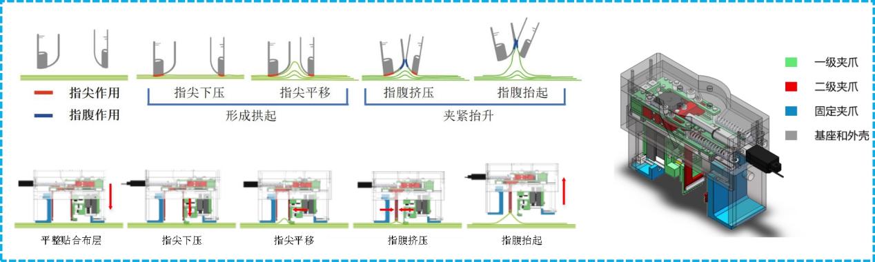 缝纫技艺是古代劳动人民智慧的深厚积淀,其传承与创新离不开广大手工技艺者的实践。在相关技术开发领域,齐立哲研究员指出了关键创新方向——“结构”与“行为”的融合仿生,通过深度借鉴并解析人类高超的操作行为,将隐性的经验与技艺转化为可建模、可复用的智能化作业技能。例如,在极具挑战的布料分层抓取任务中,团队通过分解人类操作流程,发现人手通过“捏、拱、滑、夹”等一系列精细动作完成抓取。基于此,团队创新提出仿人手指尖-指腹协同作业的布料分层抓取机械手。此外,缝纫过程本身也包含“对-调-检-送-缝”等复杂的手腿眼脑协同行为,团队在此基础之上,率先开展了立体协同缝纫技术的深入研究。经过多年持续攻关,团队在该领域积累了丰富的研发经验与丰硕成果,为后续技术转化奠定了坚实基础。
