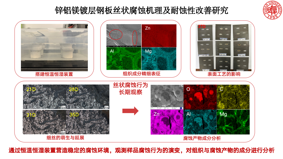 项目2通过对工况环境的有效模拟,划刻标准的确定与恒温恒湿装置的搭建,建立了ZAM镀层丝状腐蚀行为的评价方法,观测到样品腐蚀行为的演变,并通过表征手段获取了样品的组织信息与腐蚀信息。
