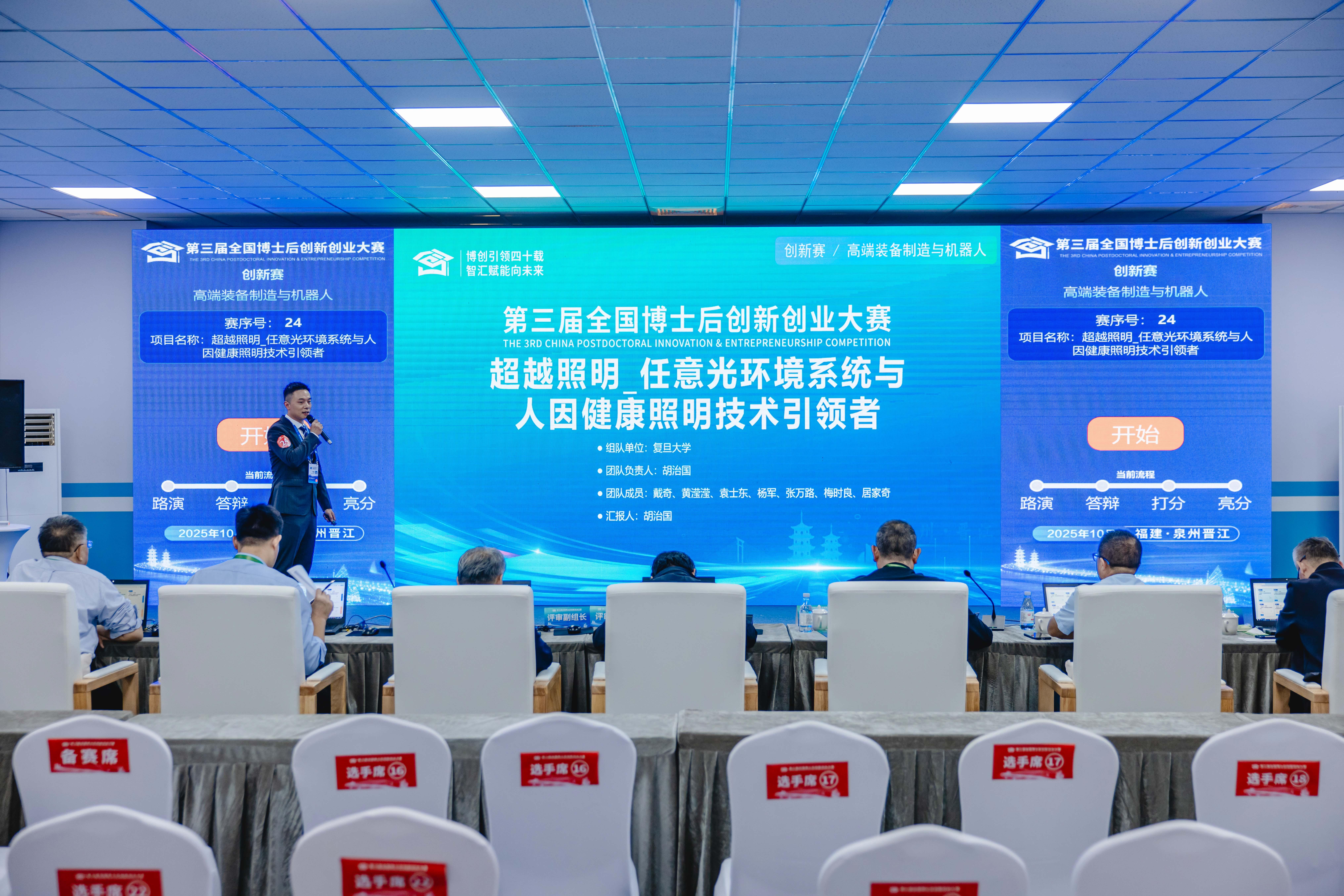 近日,第三届全国博士后创新创业大赛在福建泉州落幕。学院博士后胡治国凭借《超越照明——任意光环境系统与人因健康照明技术引领者》项目,在“高端装备制造与机器人”组别中脱颖而出,荣获创新赛金奖。