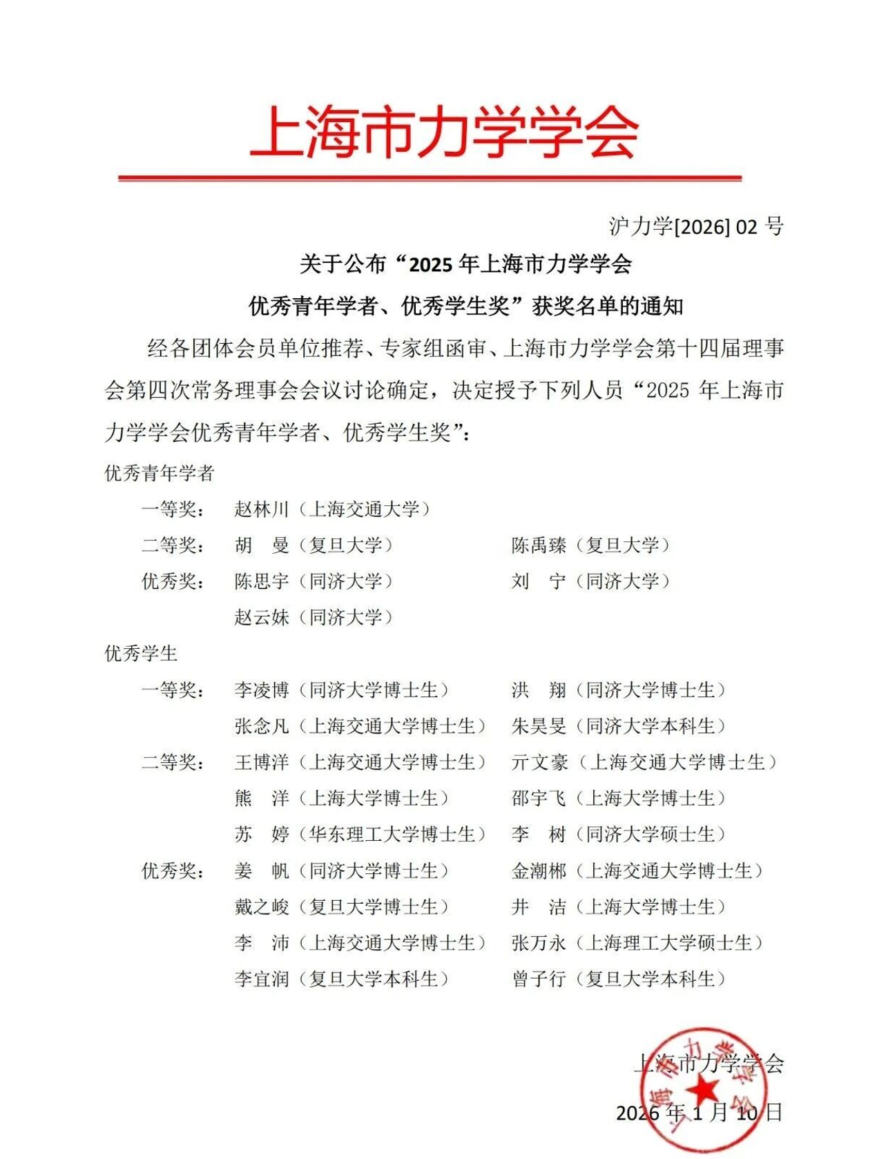 本次评选中,胡曼老师、陈禹臻老师荣获 “上海市力学学会优秀青年学者(二等奖)”;戴之峻(博士生)、李宜润(本科生)、曾子行(本科生)荣获“上海市力学学会优秀学生(优秀奖)”。