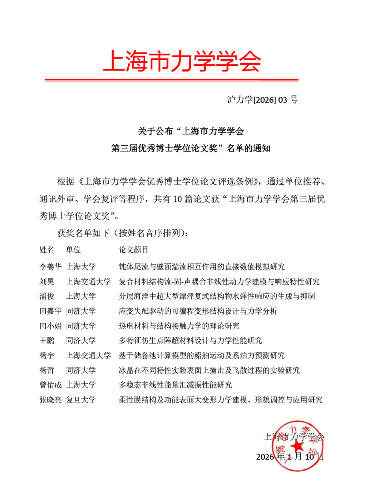张晓亮撰写的《柔性膜结构及功能表面大变形力学建模、形貌调控与应用研究》荣获“上海市力学学会第三届优秀博士学位论文奖”。