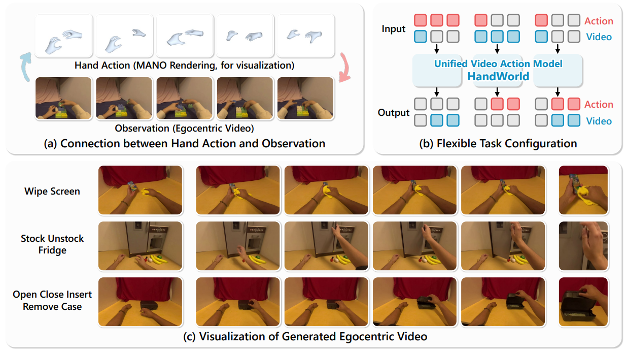 手物交互是人类与世界互动的基础,理解该场景下手部动作与第一视角视频之间的联系,对于具身智能模型学习人类感知、模拟与规划能力至关重要。然而,由于手部动作与第一视角视频之间存在非线性关系,在二者之间进行联合学习与预测具有较大挑战。在本工作中,我们提出了HandWorld,一个聚焦手物交互场景的统一生成式框架,对第一视角视频与手部动作进行联合建模。HandWorld通过一个双分支条件网络学习跨模态的共享条件表示,该网络融合了视频域与动作域的信息。同时,我们引入基于MANO渲染的手部表示作为中间输入,以进一步增强跨模态的一致性。在共享表示的条件下,模型分别训练两个解耦的扩散Transformer,用于各自模态的预测。灵活的训练策略使模型能够适应多种任务配置,包括可控视频生成与动作预测。我们在大规模第一视角手物体交互数据集上进行了充分的实验,HandWorld在视频合成质量与动作预测精度方面均表现优异,并在多种场景下超越了现有方法。