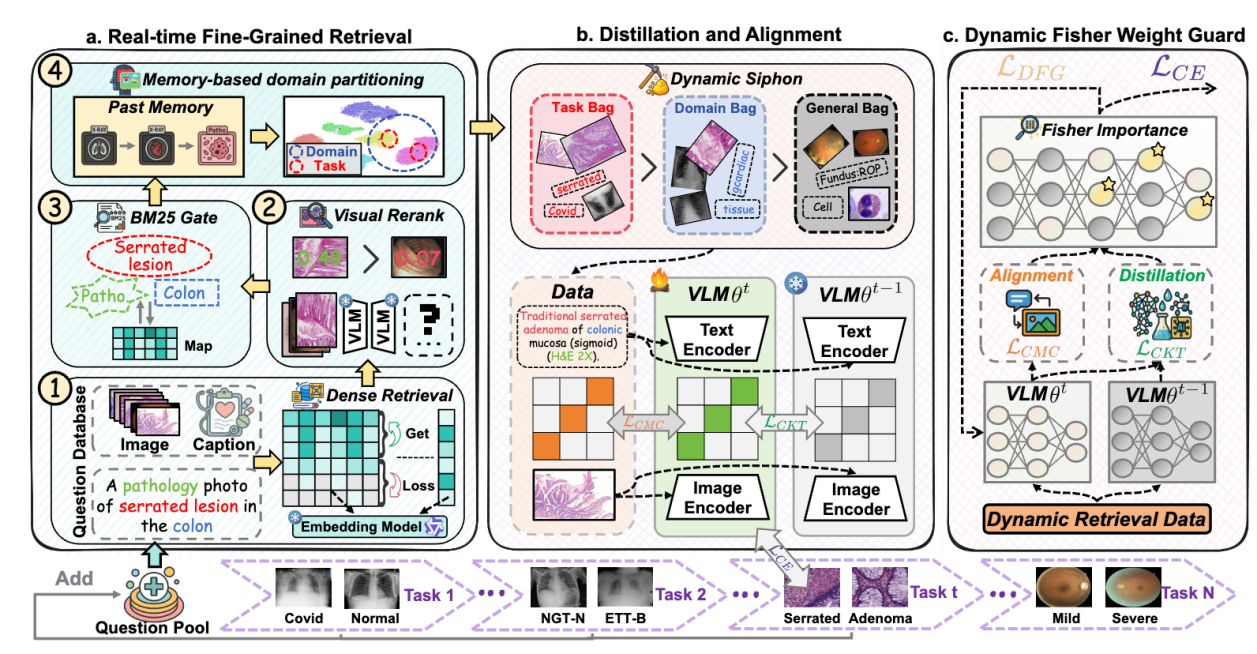 该研究提出首个医疗视觉语言大模型持续学习框架,通过构建1800万规模的医学检索库并首创性地将动态多级RAG系统引入持续学习,利用其特有的Dynamic Siphon机制精准调取任务、领域及通用三类知识流,实现了对集群化医学知识的解耦与针对性强化 ;同时,框架结合了对比知识迁移(CKT)与跨模态一致性(CMC)损失策略,并引入动态Fisher权重保护(DFG)算法来实时评估并约束关键参数,在确保模型高效获取新知识的同时,有效缓解了灾难性遗忘并保留了基础模型的零样本能力 ;此外,团队还针对性地构建了包含HieraMedTransfer与MedXtreme两个维度的MGTIL基准,填补了医学通用领域跨任务与跨领域持续学习评测体系的空白 。
