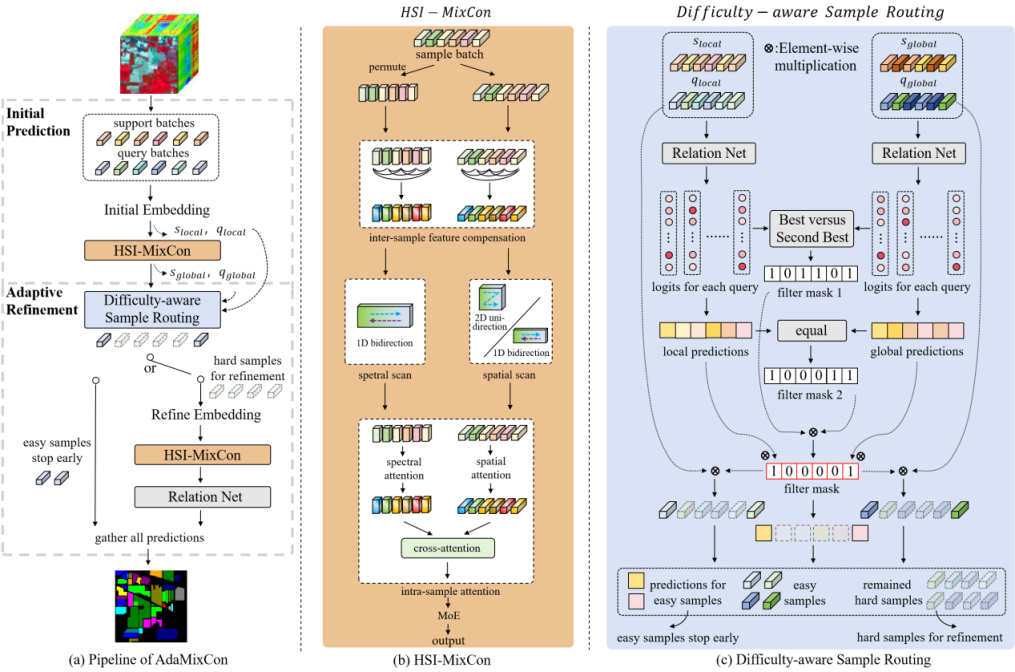 近日,我院范佳媛老师科研团队在小样本高光谱图像分类领域取得重要研究进展。相关研究成果以“AdaMixCon: Difficulty-Aware Feature Enhancement for Few-Shot Hyperspectral Image Classification”为题,发表在国际地球科学与遥感领域权威期刊IEEE Transactions on Geoscience and Remote Sensing。围绕小样本高光谱图像分类中样本依赖关系利用不足与样本难度感知缺失两大关键问题,提出一种自适应难度感知的双阶段框架AdaMixCon,为稀缺标注场景下的地物识别提供高效实用的新方案。对现有方法在处理高光谱图像数据时样本依赖关系利用不足问题,提出光谱-空间特征增强模块,引入样本间注意力与样本内注意力机制,在小样本条件下实现对样本光谱-空间特征的协同建模,有效提升特征的判别性;针对样本难度感知缺失问题,提出难度感知样本路由模块,引入样本路由机制,根据样本难度进行自适应地分类,在对困难样本实现有效分类的同时缓解简单样本的过拟合风险。