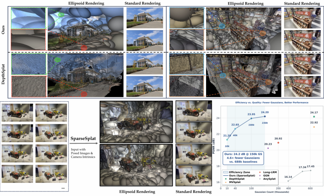 现有前馈式3D高斯泼溅方法普遍采用'像素对齐'策略,为每个像素生成一个高斯基元,导致场景表征高度冗余,严重制约其在无人车、无人机、AR眼镜等资源受限平台上的落地。本研究系统揭示了现有方法的两个根本缺陷:分布不匹配(刚性均匀结构无法捕捉3DGS优化的内容自适应特性)和感受野不匹配(全局感知却单点预测,偏离3DGS优化的局部本质)。针对此,研究团队提出SparseSplat框架:一是基于香农信息熵的自适应采样策略,摒弃像素对齐范式,根据局部信息丰富度自适应调节基元密度,并通过温度参数灵活控制稀疏度;二是3D局部属性预测器,利用K近邻聚合三维局部邻域信息预测高斯属性,使感受野与优化本质对齐。