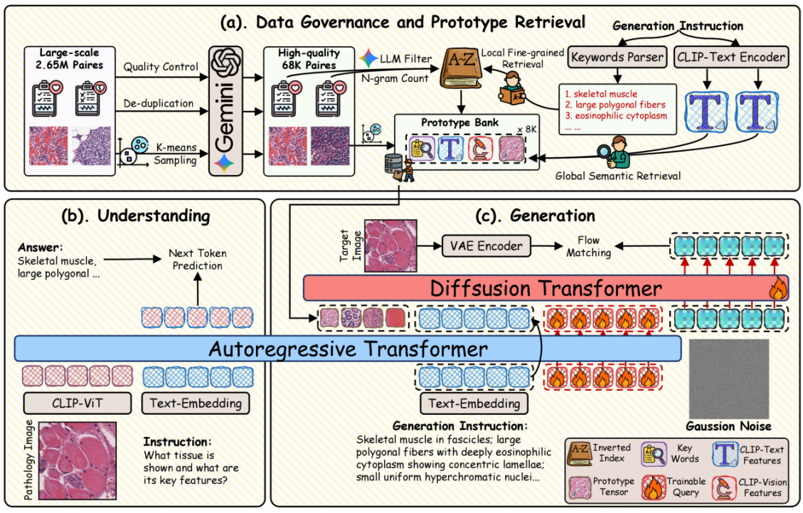 近日,复旦大学张立华教授团队在计算病理学与生成式人工智能领域取得突破性进展。针对现有病理学图像生成模型过度依赖像素级模拟、缺乏精确细粒度语义控制以及面临医学术语异质性等瓶颈问题,该团队提出了名为 UniPath的全新语义驱动病理图像生成理解统一框架。UniPath创新性地利用成熟的诊断理解模型(病理学 MLLM)来引导可控生成,实现了理解与生成的统一。这一框架不仅极大地缓解了高质量图文数据稀缺的难题,更为提升大模型在复杂病理环境中的形态学控制力提供了全新的技术支撑。