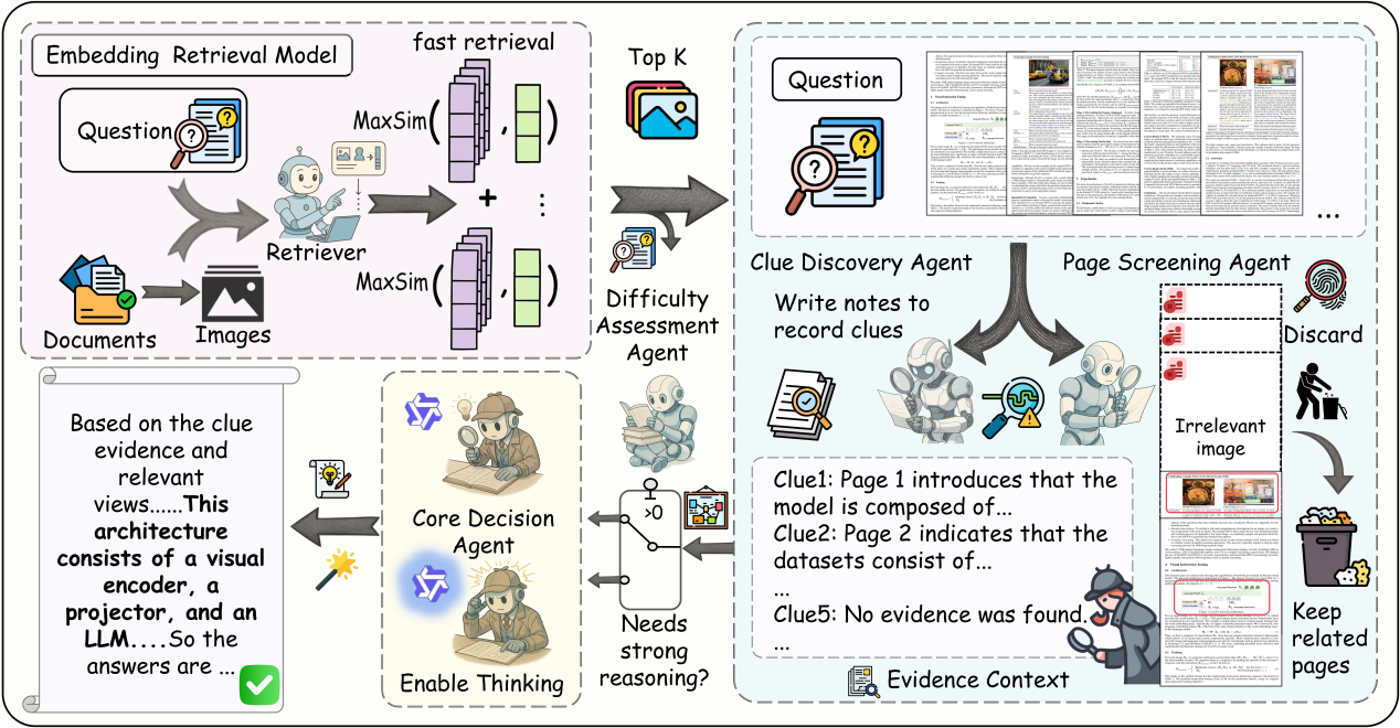 真实长文档场景中,关键信息往往分散在多页、多模态内容中,而大模型在面对长上下文时容易受到冗余干扰甚至产生幻觉。针对这一挑战,SLEUTH 从“上下文构建”的角度出发,提出构建“高密度证据上下文”的新范式,而非单纯依赖更长输入或更大模型规模,为长文档多模态理解提供了全新的技术路径。提出多智能体上下文工程框架SLEUTH 构建了一个“检索收缩 → 线索挖掘 → 视觉筛选 → 难度自适应推理”的层级化流程,通过四个协同智能体对长文档进行逐页精炼处理,在固定上下文长度下最大化证据密度,有效缓解长上下文带来的推理干扰问题。设计双层证据构建机制,实现细粒度线索与全局视觉结构互补,两个智能体分别以页为单位提取结构化证据(文本、表格、图表区域级线索),并保留来源与推理依据;从整体视觉结构层面对页面进行相关性判断,筛除无关图像页面。二者并行协作,在压缩输入规模的同时保留关键视觉与语义信息,实现“少而精”的高质量证据上下文构建。在MMLongBench、LongDocURL、PaperTab、FetaTab四个长文档基准上,SLEUTH在多个主流视觉语言模型骨干下均取得显著提升,取得SOTA性能。相较强 RAG 和多智能体基线方法实现稳定增益,验证了“上下文质量优先于上下文长度”的核心思想。