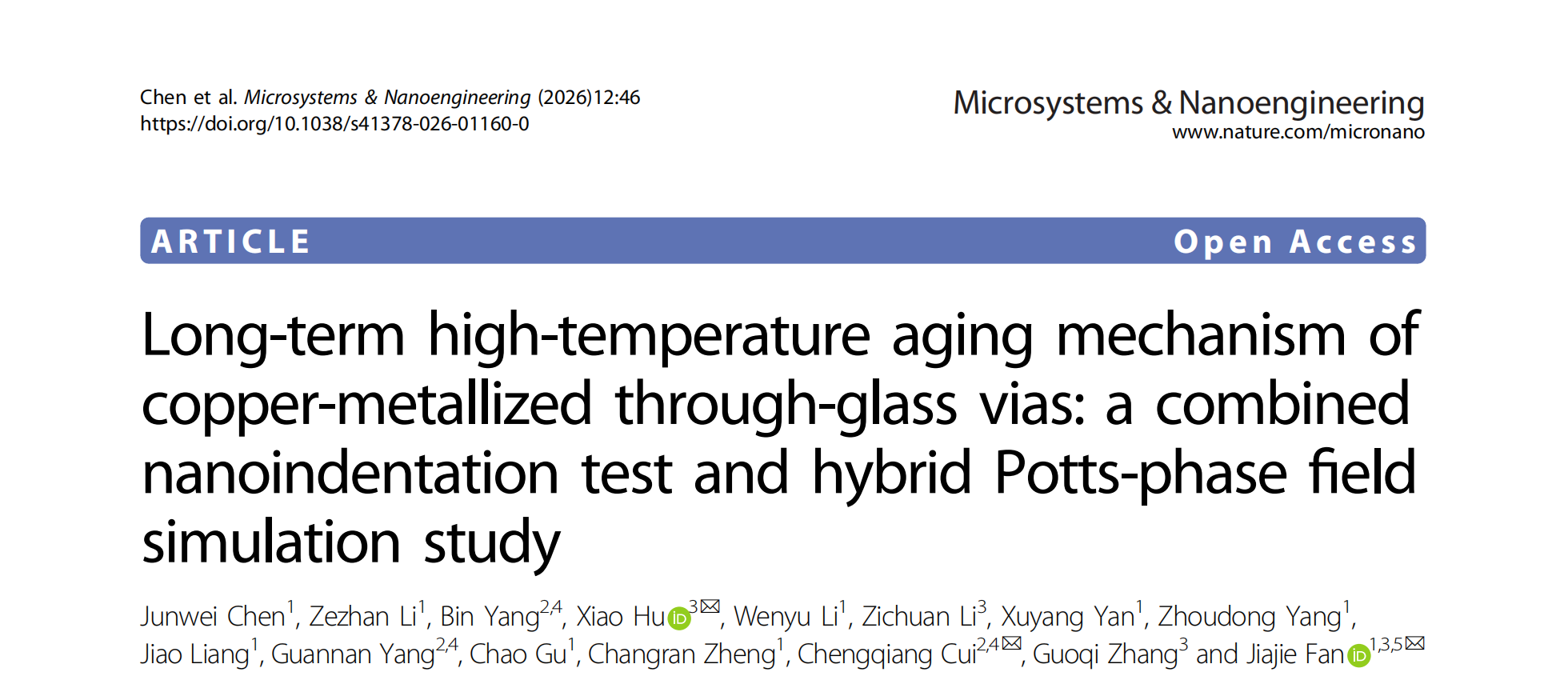 24. 超越照明所Microsystems & Nanoengineering: 融合纳米压痕测试与混合 Potts-相场模拟的铜金属化玻璃通孔(TGV-Cu)长期高温老化机制研究