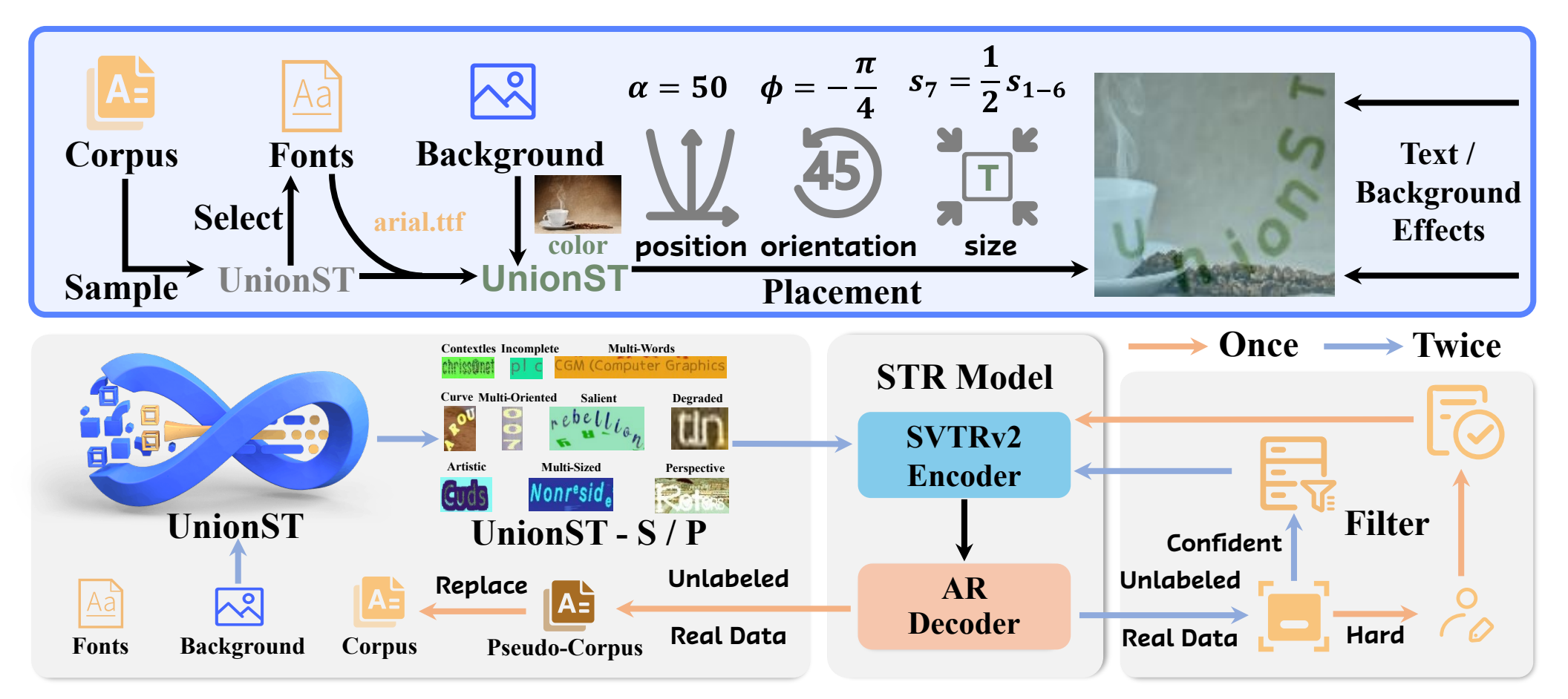 大规模、类别均衡的文字数据是训练高性能场景文本识别模型的关键所在,而直接使用真实场景数据难以满足该要求。合成数据标签精确、成本低廉,是极佳的替代方案。但基于现有合成数据训练的模型性能仍存在明显短板,说明真实数据与合成数据之间存在显著的域差异问题。针对上述问题,我们首先深入分析了现有文字数据合成引擎,指出当前方法在字体多样性、文字语义和布局丰富度上有不足,是造成基于合成数据集训练的识别模型精度大幅落后于基于真实数据训练的模型的关键。基于此,本文在字体、背景和语义丰富度三个维度进行了针对性设计,构建了一套高逼真文字实例渲染合成管线UnionST和相应的大规模合成数据集UnionST-S。我们的合成数据集相较于现有合成数据集,大幅提升了所训练模型的识别精度。本文进一步设计了自进化学习框架,利用合成数据实现真实样本的高效标注。结合自进化学习框架后,模型仅与9%的真实带标注数据混合训练后,即可训练出与当前最强模型相当的识别精度。
