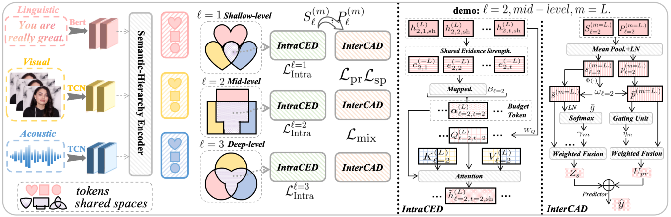 研究团队提出了跨层级协同表示(CLCR)框架,为解决多模态数据在浅、中、深层级间的语义异步性问题提供了全新方案。该框架首先通过语义层次编码器,将每个模态的特征对齐为三级语义层次结构。随后,在每一层级内,利用层内协同交换域(IntraCED)将特征解耦至共享与私有子空间,并通过可学习的令牌预算将跨模态注意力严格限制在共享空间内,有效防止语义泄露与干扰。为整合跨层级信息,层间协同聚合域(InterCAD)通过学习到的锚点同步语义尺度,选择性地融合各层共享表示并对私有线索进行门控,最终形成紧凑且高质量的任务感知表示。