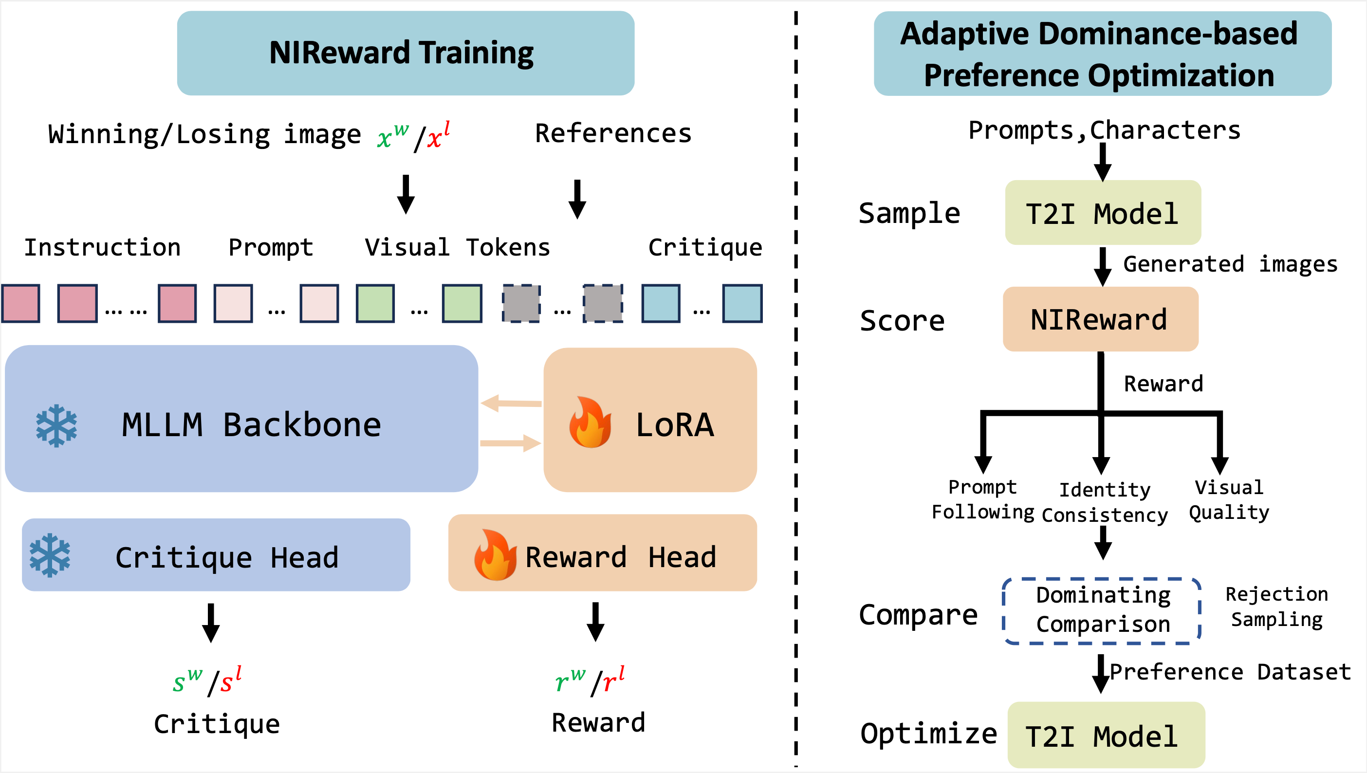叙事图像生成旨在创建包含多个不同角色并捕捉其相互关系的图像,这对当前的文本到图像扩散模型提出了重大挑战。通用的个性化方法往往面临语义对齐不佳、身份混淆以及美学失真等问题。现有的评估指标(如CLIP、ArcFace及传统奖励模型)难以充分捕捉上述问题,无法与人类感知偏好保持一致。为了对齐人类偏好,我们首先构建了一个细粒度的人类偏好数据集NI-RLHF,通过收集详细的人工评价与偏好判断,覆盖三个核心维度:提示词遵循度、身份一致性和视觉质量。基于这一数据集,我们训练了一个基于评价反馈的奖励模型NIReward,使其能够生成可解释的图像评估结果。基于NIReward提供的可解释奖励信号,我们进一步提出了自适应优势驱动的偏好优化方法(Adaptive Dominance-based Preference Optimization,ADPO),在多个偏好维度之间实现均衡学习的同时,动态适应奖励差异。实验结果表明,NIReward显著优于现有的评估模型和奖励模型,ADPO在三个关键偏好维度上均实现了显著提升。通过引入NIReward和ADPO,我们的工作为生成真正符合人类偏好的叙事图像开辟了新的道路。