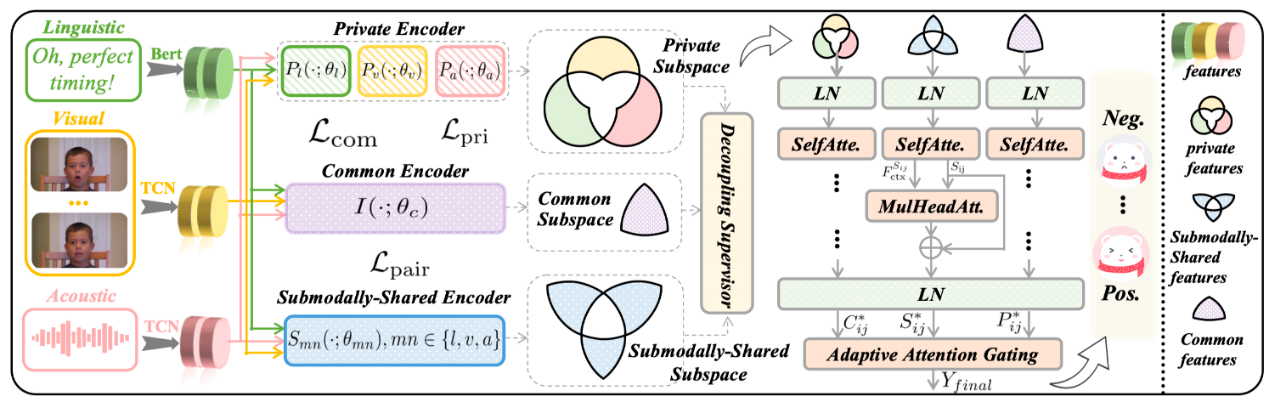研究团队提出了三子空间解耦(TSD)框架,为多模态情感分析与意图识别的细粒度线索建模提供了全新解决方案。该框架针对现有方法忽略“仅由部分模态共享的线索”(如讽刺)的问题,创新性地将多模态特征明确分解为三个纯净且独立的子空间:建模全局一致性的公共子空间、捕获成对跨模态协同的子模态共享子空间,以及保留独特线索的私有子空间。在融合阶段,框架设计了子空间感知交叉注意力(SACA)模块,以自适应地整合三路信息,从而实现更精准的情感理解。