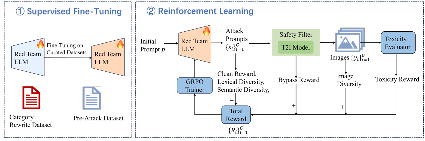 诸如Stable Diffusion之类的文生图(T2I)模型发展迅猛,现已被广泛应用于内容创作领域。然而,这类技术存在被滥用于生成裸体、暴力等违规内容的风险,带来了重大安全隐患。虽然大多数平台部署了内容审核系统,但攻击者仍可能利用底层漏洞进行突破。当前针对T2I模型的红队测试与对抗攻击研究存在关键局限:现有方法难以在提示词隐蔽性与生成图像的高毒性之间取得平衡。部分研究虽成功生成高毒性图像,但使用的对抗性提示词或其生成的图像易被安全过滤器检测拦截;另一些研究专注于提升隐蔽性以绕过安全机制,却难以产出真正有害的内容,忽视了对高危漏洞的发掘。这导致业界仍缺乏评估配备防御机制的T2I模型的安全性的可靠工具。为填补这一空白,我们提出GenBreak框架——通过微调红队大语言模型来系统化探索文生图模型的潜在漏洞。该方法首先在精选数据集上进行监督微调,再通过与代理T2I模型交互进行强化学习,整合多重奖励信号引导LLM生成兼具规避能力与图像毒性的对抗性提示词,同时保持提示词的语义连贯性与多样性。实验表明,这些提示词在黑盒迁移攻击场景下对商用T2I模型表现出高威胁性,有效揭示了实际部署中存在的安全缺陷。